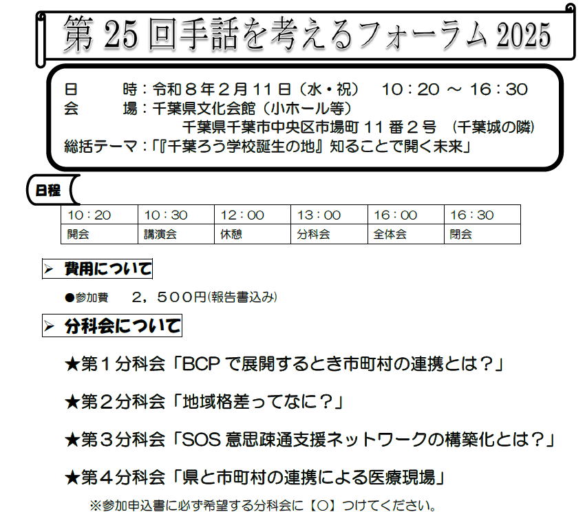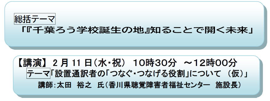日時:令和8年 2月11日(水・祝) 10:20 ~ 16:30 会場:千葉県文化会館(小ホール等) 千葉県千葉市中央区市場町11番2号 (千葉城の隣) 総括テーマ:「『千葉ろう学校誕生の地』知ることで開く未来」 |