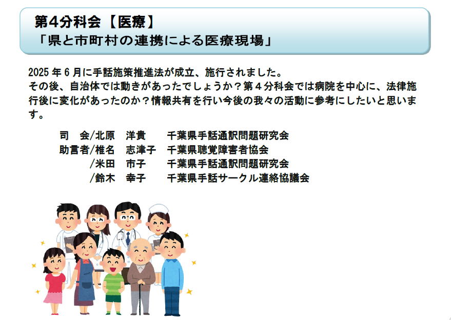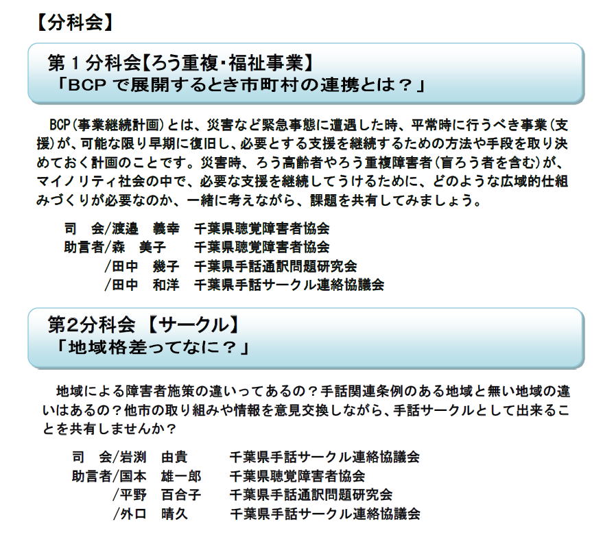 ★第1分科会「BCPで展開するとき市町村の連携とは?」 ★第2分科会「地域格差ってなに?」 ★第3分科会「SOS意思疎通支援ネットワークの構築化とは?」 ★第4分科会「県と市町村の連携による医療現場」 |