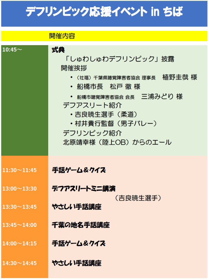 体験しよう! ![]() 遊びにくるよ! ![]() 式典 10:45~11:15 ![]() ![]() ![]() ■ 吉良選手 (男子柔道 60Kg級) ■ 村井監督 (男子バレーボール) 9月23日は ![]() 世界中でブルーライトアップが行われます。 イオンモール船橋でも! 東京2025デフリンピックをもっと知りたい方は 一般財団法人 全日本ろうあ連盟 スポーツ委員会 公式サイトへ 公益財団法人 東京都スポーツ文化事業団 デフリンピック準備運営本部 公式サイトへ  |